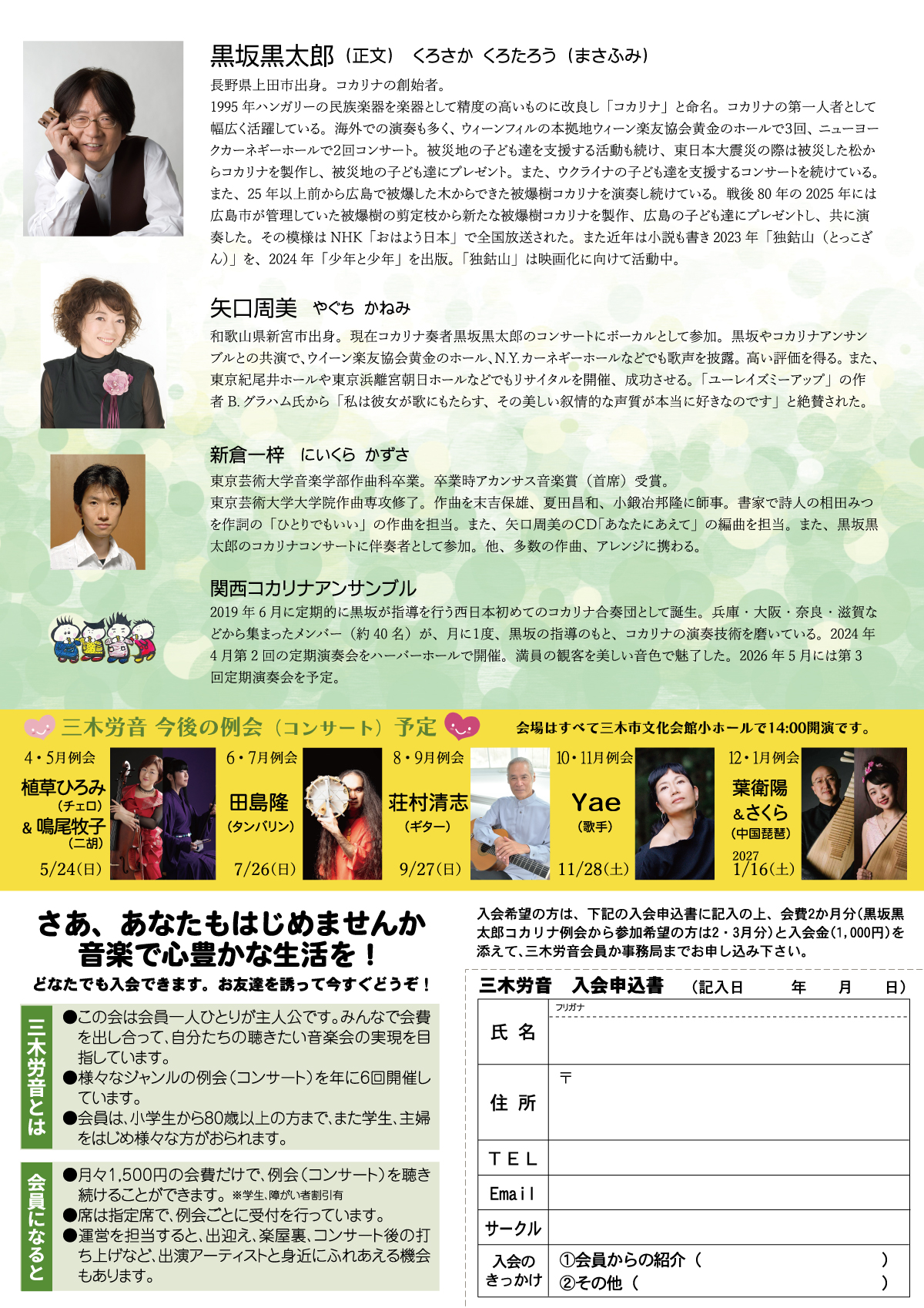 黒坂黒太郎 コカリナとうたのコンサート 2026年3月29日(日)14:00開演 三木市文化会館小ホール 黒坂黒太郎(正文)(くろさかくろたろう/まさふみ)/コカリナ 長野県上田市出身。コカリナの創始者。 1995年ハンガリーの民族楽器を楽器として精度の高いものに改良し「コカリナ」と命名。コカリナの第一人者として幅広く活躍している。海外での演奏も多く、ウィーンフィルの本拠地ウィーン楽友協会黄金のホールで3回、ニューヨークカーネギーホールで2回コンサート。被災地の子ども達を支援する活動も続け、東日本大震災の際は被災した松からコカリナを製作し、被災地の子ども達にプレゼント。また、ウクライナの子ども達を支援するコンサートを続けている。また、25年以上前から広島で被爆した木からできた被爆樹コカリナを演奏し続けている。戦後80年の2025年には広島市が管理していた被爆樹の剪定枝から新たな被爆樹コカリナを製作、広島の子ども達にプレゼントし、共に演奏した。その模様はNHK「おはよう日本」で全国放送された。また近年は小説も書き2023年「独鈷山(とっこざん)」を、2024年「少年と少年」を出版。「独鈷山」は映画化に向けて活動中。 NPO法人日本コカリナ協会ホームページ https://www.kocarina-k.or.jp/ 矢口周美(やぐちかねみ)/うた 和歌山県新宮市出身。現在コカリナ奏者黒坂黒太郎のコンサートにボーカルとして参加。黒坂やコカリナアンサンブルとの共演で、ウイーン楽友協会黄金のホール、N.Y.カーネギーホールなどでも歌声を披露。高い評価を得る。また、東京紀尾井ホールや東京浜離宮朝日ホールなどでもリサイタルを開催、成功させる。「ユーレイズミーアップ」の作者B.グラハム氏から「私は彼女が歌にもたらす、その美しい叙情的な声質が本当に好きなのです」と絶賛された。 新倉一梓(にいくら かずさ)/ピアノ 東京芸術大学音楽学部作曲科卒業。卒業時アカンサス音楽賞(首席)受賞。 東京芸術大学大学院作曲専攻修了。作曲を末吉保雄、夏田昌和、小鍛冶邦隆に師事。書家で詩人の相田みつを作詞の「ひとりでもいい」の作曲を担当。また、矢口周美のCD「あなたにあえて」の編曲を担当。また、黒坂黒太郎のコカリナコンサートに伴奏者として参加。他、多数の作曲、アレンジに携わる。 関西コカリナアンサンブル 2019年6月に定期的に黒坂が指導を行う西日本初めてのコカリナ合奏団として誕生。兵庫・大阪・奈良・滋賀などから集まったメンバー(約40名)が、月に1度、黒坂の指導のもと、コカリナの演奏技術を磨いている。2024年4月第2回の定期演奏会をハーバーホールで開催。満員の観客を美しい音色で魅了した。2026年5月には第3回定期演奏会を予定。 | ![]() ![]() ※チラシ画像をクリックすると別画面で拡大表示されます。 |