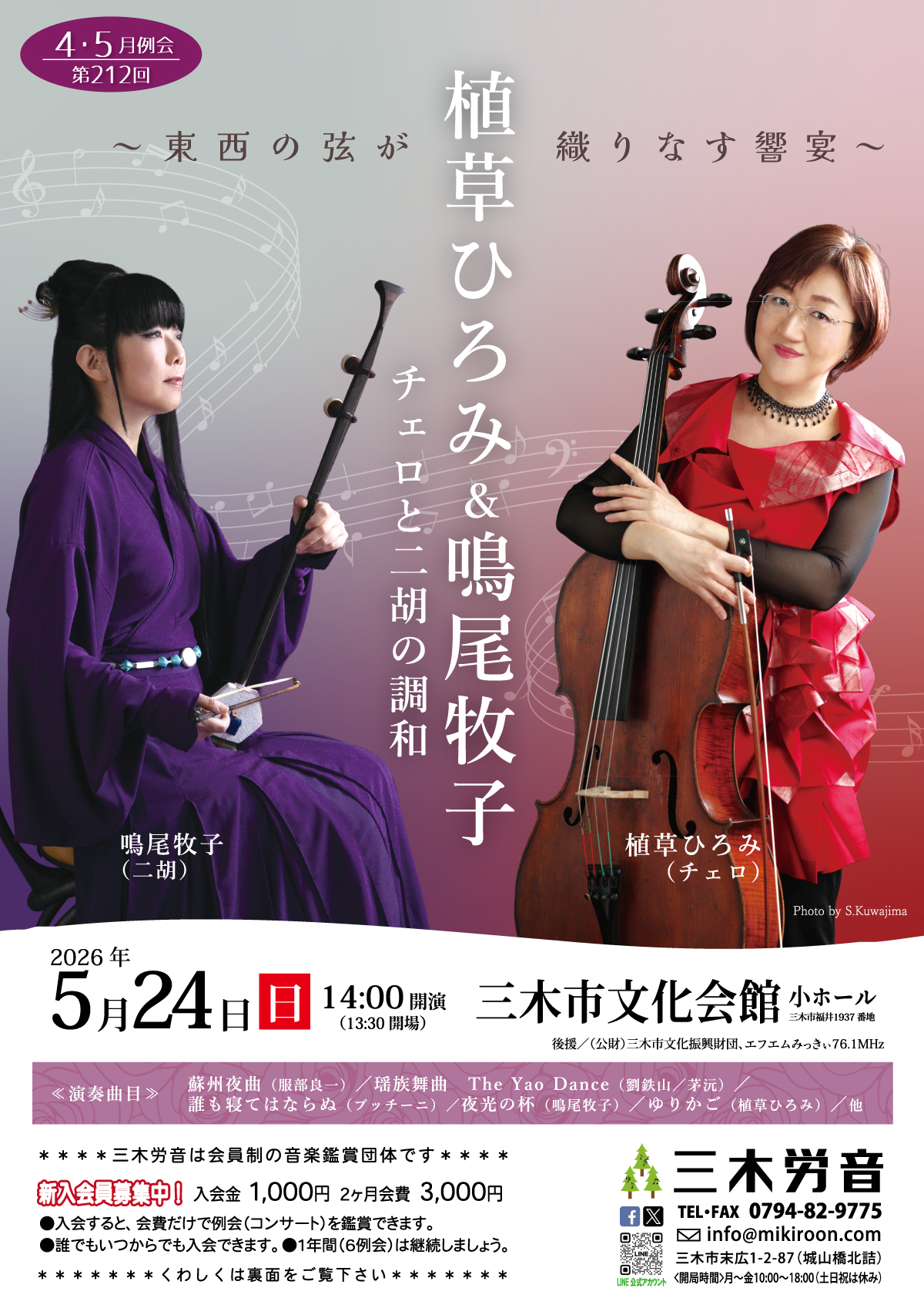 葉衛陽×さくら 中国琵琶が描く 千年の音風景 共演/富田裕三子(ピアノ) 2027年1月16日(土)14:00開演 三木市文化会館小ホール 葉衛陽(よう えいよう)(中国琵琶) 中国・杭州市生まれの中国琵琶奏者。10歳より中国琵琶を学び、安徽師範大学音楽学部にて著名な琵琶演奏家・潘雅伯教授に師事し、琵琶専攻を首席で卒業。中国のテレビ局で音楽プロデューサーを務めた後、1992年に来日。京都教育大学大学院音楽教育専攻修士課程を修了した。繊細かつ高度な演奏技術を駆使し、古典曲から現代作品まで幅広いレパートリーを持つ。関西を中心に数多くのリサイタルを開催し、高い評価を受けている。弟子・さくらの国際的な活躍により、香港国際藝壇より「園丁奨(教授賞)」、遼源国際琵琶文化芸術祭において「優秀教師賞」を受賞。CDアルバム『悠々弦韻』?〜?をリリース。中国音楽家協会琵琶研究会会員、京都華僑総会理事、日本中華文学芸術家連合会会長、長城楽団代表を務め、現在は演奏活動と並行して中国音楽教育にも力を注いでいる。宇治市在住。 さくら(叶桜)(中国琵琶) 京都生まれの中国琵琶奏者。3歳より父・葉衛陽に師事し、9歳から演奏活動を開始した。2007年、中国中央電視台(CCTV)主催「中国民族楽器コンクール」において最年少で銅賞を受賞。その後も2009年第10回中国音楽コンクールで金賞および中華人民共和国駐大阪総領事賞、第10回大阪国際音楽コンクール民族楽器部門第2位、第1回香港国際中国器楽コンクール海外琵琶部門金賞を受賞するなど、国内外の主要コンクールで高い評価を受けている。2012年には遼源国際琵琶文化芸術祭で銀賞、2014年には敦煌杯国際琵琶コンクール金賞、中国音楽国際コンクール特等賞を受賞。ボランティア演奏活動も積極的に行い、鳳凰賞(宇治鳳凰ロータリークラブ)や宇治市ジュニア文化賞を3度受賞した。葉衛陽との「親子中国琵琶の競演」は各地で人気を博している。CD『美しい日本 四季のうた』『芽吹きの風』『中国琵琶 さくら独奏曲集』を発表。上海復旦大学、上海音楽学院に留学後、東京外国語大学を卒業し、現在は日本全国で演奏活動を行っている。 富田裕三子(ピアノ) 神戸山手女子短期大学音楽科ピアノ専攻卒業。二胡や中国琵琶など中国民族楽器の伴奏・編曲を中心に活動し、特に難度が高いとされる二胡伴奏に定評がある。新潟中越地震仮設住宅訪問演奏、四川大地震チャリティーコンサート、兵庫のじぎく国体、プラネタリウムコンサート、京都国際中国芸術文化祭など、文化・福祉・国際交流の場で幅広く演奏。日中平和友好条約45周年、神戸市―天津市友好都市連携50周年、国際音楽協会25周年記念演奏会などにも参加している。現在、中国琵琶および柳琴を葉衛陽に師事し、中国音楽コンクールにて中国琵琶奨励賞、柳琴入賞を受賞。特定非営利活動法人国際音楽協会 国際民族楽団、長城楽団「葉ざくらアンサンブル」に所属。 | ![]() ![]() ![]() |