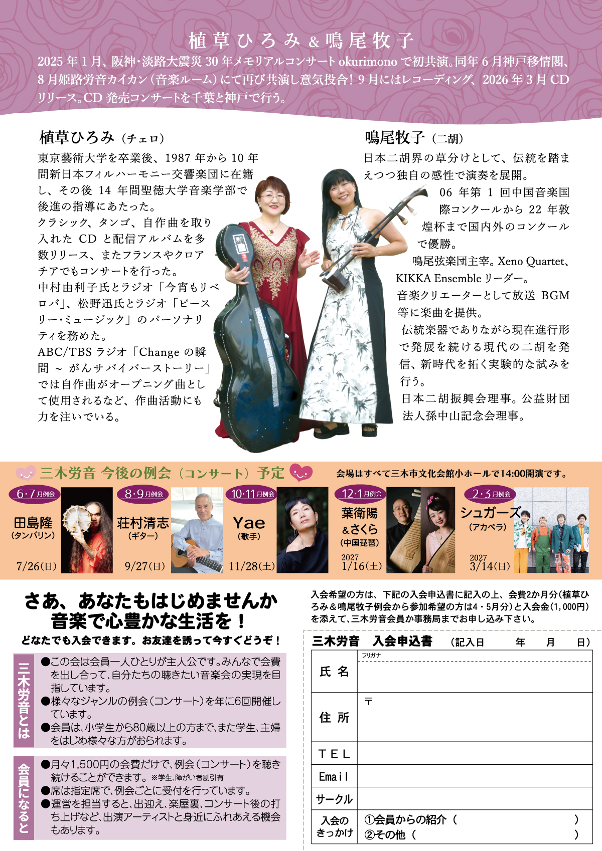 Yae 25th コンサート―いのち・つなぐ・うたう― 共演:越田太郎丸(ギター)、啼鵬(バンドネオン、ピアノ) 2026年11月28日(土)14:00開演 三木市文化会館小ホール Yae(ヤエ)(半農半歌手/シンガーソングライター) 故藤本敏夫・歌手加藤登紀子の次女。2001年に歌手デビュー。 NHKみんなのうたや人気ゲームソフト「ファイナルファンタジークリスタルクロニクル」の主題歌やナレーションなどを歌唱。世界平和音楽祭や国内外での音楽祭を主催または積極的に参加。家族5人とともに自然豊かな里山「鴨川自然王国」で、農を取り入れた農的暮らしを営む。環境省「つなげよう・支えよう 森里川海プロジェクト」アンバサダー。ラジオなどのパーソナリティーを務めながらライブを中心に全国で活躍中。2020年にアルバム「On The Border」また2023年には9枚目のアルバム「80億の祈り」を発表。加藤登紀子がカバーし、60周年のタイトルにもなった。2024年NHKラジオ深夜便のうた「HOME」を歌唱。翌年8月には平和への願いを込めて、新曲「いのちの灯(ひ)」をリリース、EXPO2025大阪・関西万博にて披露した。またブラジルで開催されたCOP30にも参加、音楽だけでなく環境や食をテーマに幅広く活動している。 Yaeオフィシャルサイト https://yaenet.com/ ソーシャルアクション(社会活動) 2007年〜 種まき大作戦「土と平和の祭典」実行委員長 http://www.tanemaki.jp 2011年〜 福島県 飯館村 『までい大使』 2018年〜 環境省「つなげよう、支えよう森里川海アンバサダー」 2025年11月 ブラジル ベレンにて開催されたCOP30に参加。 越田太郎丸(こしだたろま)(ギター) 9歳からギターを始める。大学時代より各種イベントに出演。 ボサノバとクラブミュージックを融合させたユニット『Prismatica』のギタリストとして1997年にCDデビューしベスト盤を含む7枚のアルバムをリリース。 アントニオ・カルロス・ジョビン、トニーニョ・オルタ、ジョアン・ボスコ、など主にブラジルのアーティストから作曲、編曲、奏法の影響を受けブラジル音楽を軸に演奏活動を展開。 ギター以外にカバキーニョ、チャランゴ、ウクレレ、フラットマンドリンなども演奏。 ブラジル音楽をこよなく愛するも、その活動は多岐に渡り、これまでに中森明菜、岩崎宏美、辛島美登里、姿月あさと、遊佐未森、石丸幹二、香寿たつき、葉加瀬太郎、Jazztronik、coba、Le Velvets、瀬木貴将、NAOTO、ウェイウェイウー、Yae、中孝介、城南海(順不同)など 様々なアーティストのライブサポートやレコーディングに参加。 最新作はギター独奏によるフルアルバム"Twenty Years/越田太郎丸“(2018年6月リリース)。 越田太郎丸(こしだたろま)は本名。 啼鵬(ていほう)(バンドネオン、ピアノ) 東京芸術大学作曲科卒業。在学中からプロ活動を開始。独習したバンドネオンをはじめ、様々な楽器を操るマルチ・ミュージシャン。NHK朝ドラ「てっぱん」等の音楽を担当。FMうしくうれしく放送ではパーソナリティーも務める。 |